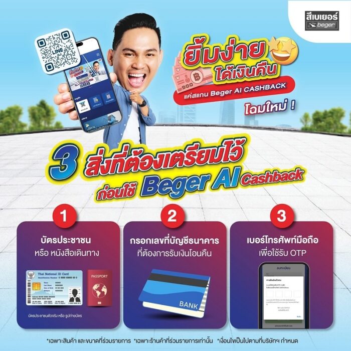 เบเยอร์มุ่งมั่นพัฒนานวัตกรรมเพื่อให้ทั้งผู้ซื้อและคู่ค้าได้รับประโยชน์สูงสุด ลดปัญหาเอกสารและความล่าช้าของระบบ พร้อมสร้างโอกาสและเครื่องมือให้ร้านค้าไทยสามารถแข่งขันและเติบโตได้อย่างมั่นคงในยุคดิจิทัล ติดตามข้อมูลเพิ่มเติมรายละเอียดเกี่ยวกับผลิตภัณฑ์สีเขียวและโครงการความร่วมมือต่างๆสามารถติดตามข้อมูลเพิ่มเติมได้ที่ : https://landing.beger.co.th/beger-ai-v2-cashback/
