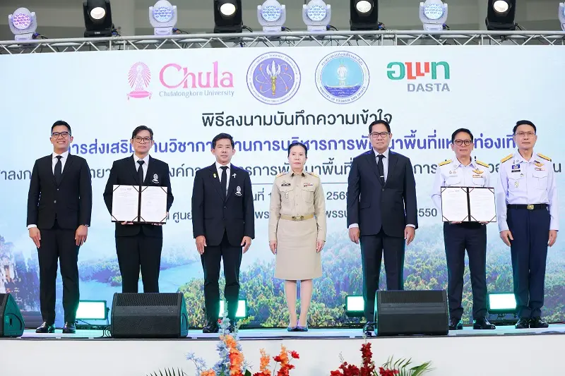 นายศิริปกรณ์ เชี่ยวสมุทร ผู้อำนวยการองค์การบริหารการพัฒนาพื้นที่พิเศษเพื่อการท่องเที่ยวอย่างยั่งยืน (องค์การมหาชน) หรือ อพท. พร้อมด้วยผู้ช่วยศาสตราจารย์สรายุทธ ทรัพย์สุข คณบดีคณะสถาปัตยกรรมศาสตร์ จุฬาลงกรณ์มหาวิทยาลัย ร่วมลงนามบันทึกความเข้าใจ เรื่อง การส่งเสริมด้านวิชาการด้านการบริหารการพัฒนาพื้นที่แหล่งท่องเที่ยว เพิ่มศักยภาพการบริหารจัดการแหล่งท่องเที่ยวอย่างยั่งยืนในระดับสากล