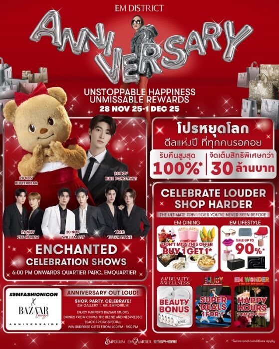 เอ็ม ดิสทริค (เอ็มโพเรียม, เอ็มควอเทียร์, เอ็มสเฟียร์) จับมือกว่า 30 พันธมิตร สร้างปรากฏการณ์ครั้งยิ่งใหญ่จัดงาน EM DISTRICT ANNIVERSARY: UNSTOPPABLE HAPPINESS UNMISSABLE REWARDS และ “EM DISTRICT WINTER WONDERLAND” ระหว่างวันที่ 27 พฤศจิกายน ถึง วันที่ 5 มกราคม 2569 – เฉลิมฉลองครบรอบ 2 ปีแห่งความสำเร็จ ในการเป็นย่านการค้าระดับโลกที่เติมเต็มความสมบูรณ์แบบของกรุงเทพมหานคร สร้างความสุขรับเทศกาลคริสต์มาสและปีใหม่ ด้วยการทุ่มงบประมาณกว่า 200 ล้านบาท จัดอภิมหาแคมเปญโปรโมชั่นมอบของรางวัลรวมกว่า 30 ล้านบาท พร้อมด้วยอีเวนต์สุดยิ่งใหญ่ ตระการตา ยาวนานกว่า 1 เดือนเต็ม ตอกย้ำภาพลักษณ์การเป็นหนึ่งในศูนย์กลางไลฟ์สไตล์ และ ENTERTAINMENT HUB ระดับโลก ที่เป็นเดสทิเนชั่นของนักท่องเที่ยวทั่วโลก