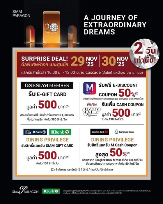 บัตรกำนัลแทนเงินสดและคูปองส่วนลด 50% เพียง 2 วัน 29-30 พ.ย.2568 เวลา 10.00 น.-13.00 น. ณ Cascade โดยสมาชิก ONESIAM SuperApp 300 คนแรก/วัน แลกรับ E-Gift card มูลค่า 500 บาท และสมาชิก M Card 300 ท่านแรก/วัน รับสิทธิ์แลกรับ E – Discount Coupon 50% สำหรับใช้ซื้อสินค้าภายในห้างฯ สิทธิพิเศษสำหรับผู้ถือบัตรเครดิตวันสยามกสิกรไทย และบัตรเครดิตกสิกรไทย 150 ท่านแรก/วัน รับสิทธิ์แลกรับ Siam Gift Card 500 บาท ผู้ถือบัตรเครดิตธนาคารกรุงเทพ เอ็ม วีซ่า รับสิทธิ์ 100 สิทธิ์/วัน และบัตรเครดิตธนาคารกรุงเทพ จำกัด 50 สิทธิ์/วัน